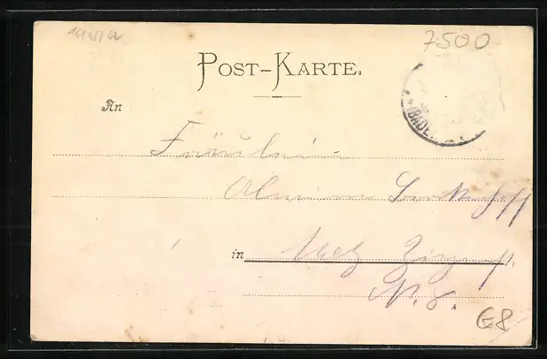 Personenbezogene Daten auf der Rückseite der Karte wurden durch blauen Textmarker unkenntlich gemacht. Die blauen Stellen sind auf die Vorderseite durchgeweicht und wirken sich negativ auf das Postkartenfoto aus