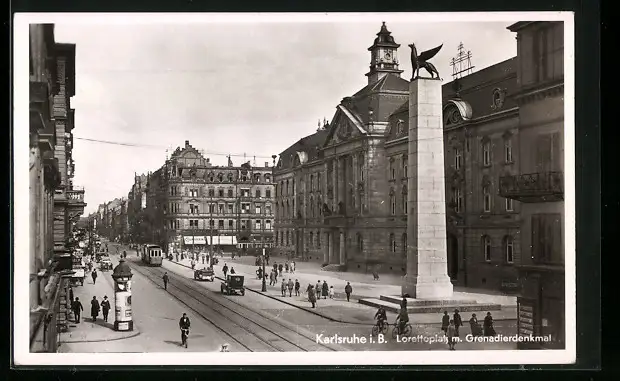 AK Karlsruhe i. B., Lorettoplatz mit Grenadierdenkmal und Strassenbahn