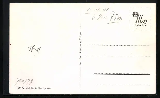 Personenbezogene Daten auf der Rückseite der Karte wurden durch blauen Textmarker unkenntlich gemacht. Die blauen Stellen sind auf die Vorderseite durchgeweicht und wirken sich negativ auf das Postkartenfoto aus