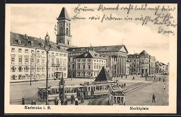AK Karlsruhe i. B., Marktplatz mit Strassenbahn