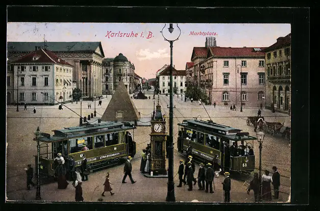 AK Karlsruhe i. B., Marktplatz mit Strassenbahnen
