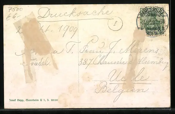 alte Ansichtskarte, gelaufen 1909, rückseitig Klebe- und Papierreste, rückseitig Oberflächenschaden, Eckknick li. oben, Abriebspur li. oben