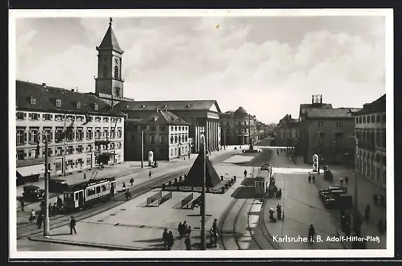 AK Karlsruhe i. B., Platz mit Strassenbahn