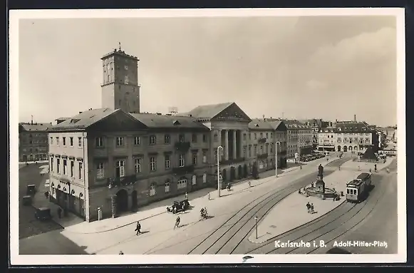 AK Karlsruhe i. B., Platz mit Strassenbahn