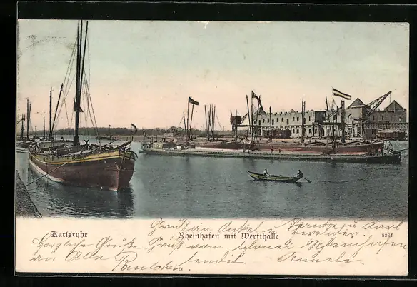 AK Karlsruhe i. B., Rheinhafen-Partie mit Werfthalle