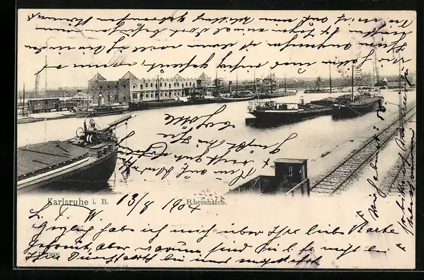 AK Karlsruhe i. B., Rheinhafen mit Bahnschienen