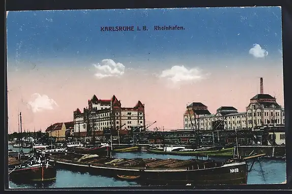 AK Karlsruhe i. B., Rheinhafen mit Dampfern