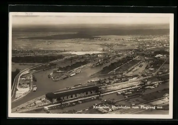 AK Karlsruhe i. B., Rheinhafen vom Flugzeug aus