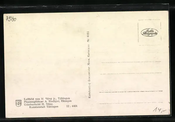 Personenbezogene Daten auf der Rückseite der Karte wurden durch blauen Textmarker unkenntlich gemacht. Die blauen Stellen sind auf die Vorderseite durchgeweicht und wirken sich negativ auf das Postkartenfoto aus