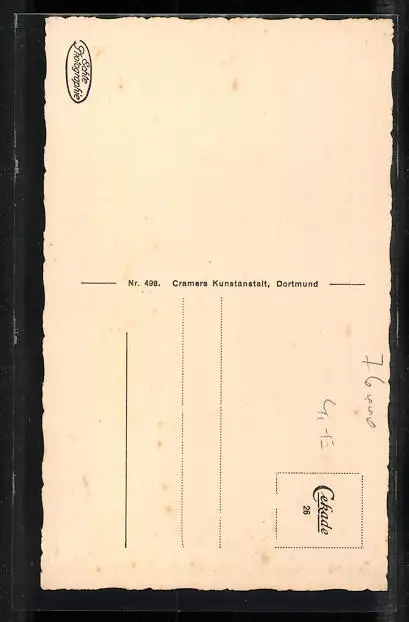 Personenbezogene Daten auf der Rückseite der Karte wurden durch blauen Textmarker unkenntlich gemacht. Die blauen Stellen sind auf die Vorderseite durchgeweicht und wirken sich negativ auf das Postkartenfoto aus