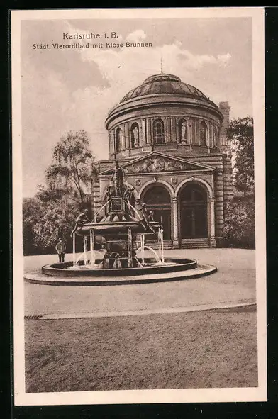AK Karlsruhe i. B., Städtisches Vierordtbad mit Klose-Brunnen