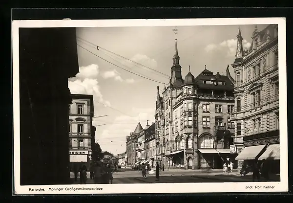 AK Karlsruhe i. B., Strassenansicht mit Moninger Grossgaststättenbetrieben