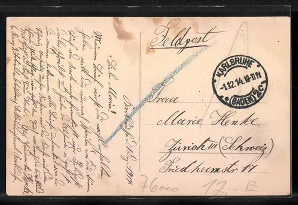 Personenbezogene Daten auf der Rückseite der Karte wurden durch blauen Textmarker unkenntlich gemacht. Die blauen Stellen sind auf die Vorderseite durchgeweicht und wirken sich negativ auf das Postkartenfoto aus