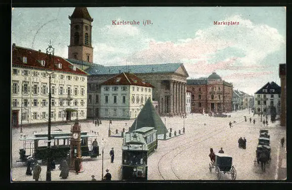 AK Karlsruhe i. B., Strassenbahnen auf dem Marktplatz