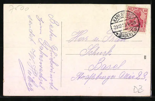 Personenbezogene Daten auf der Rückseite der Karte wurden durch blauen Textmarker unkenntlich gemacht. Die blauen Stellen sind auf die Vorderseite durchgeweicht und wirken sich negativ auf das Postkartenfoto aus