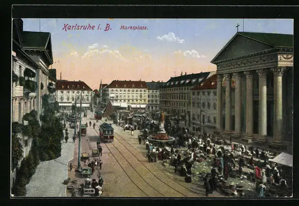 AK Karlsruhe i. B., Strassenbahnverkehr auf dem Marktplatz