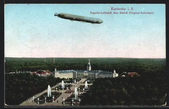 AK Karlsruhe i. B., Zeppelin-Luftschiff über Schloss