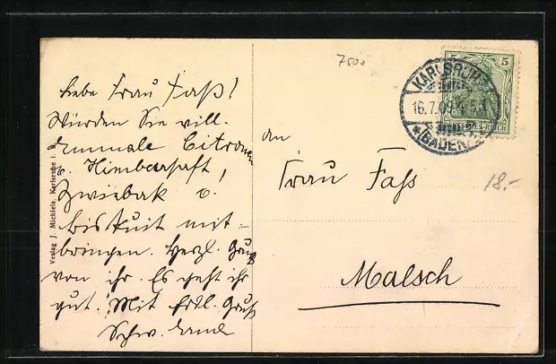 Personenbezogene Daten auf der Rückseite der Karte wurden durch blauen Textmarker unkenntlich gemacht. Die blauen Stellen sind auf die Vorderseite durchgeweicht und wirken sich negativ auf das Postkartenfoto aus