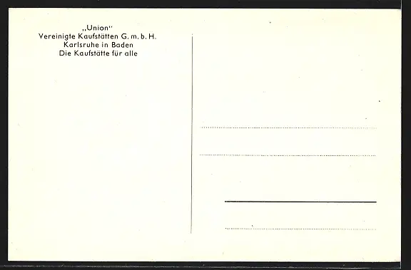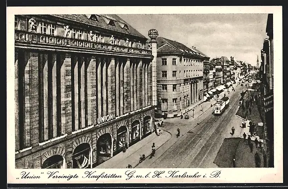 AK Karlsruhe in Baden, Union Vereinigte Kaufstätten G.M.B.H., Strassenbahn