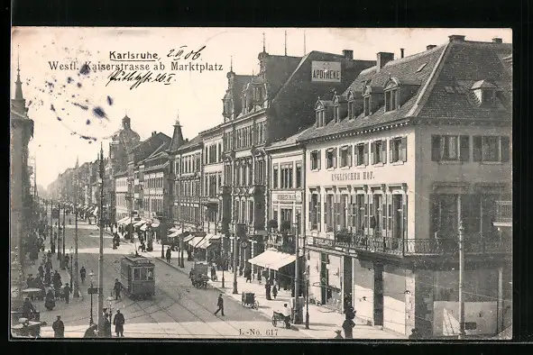 AK Karlsruhe, westl. Kaiserstrasse mit Strassenbahn