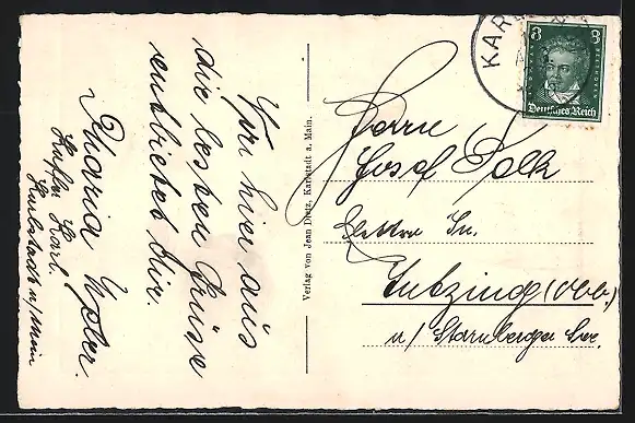 Personenbezogene Daten auf der Rückseite der Karte wurden durch blauen Textmarker unkenntlich gemacht. Die blauen Stellen sind auf die Vorderseite durchgeweicht und wirken sich negativ auf das Postkartenfoto aus