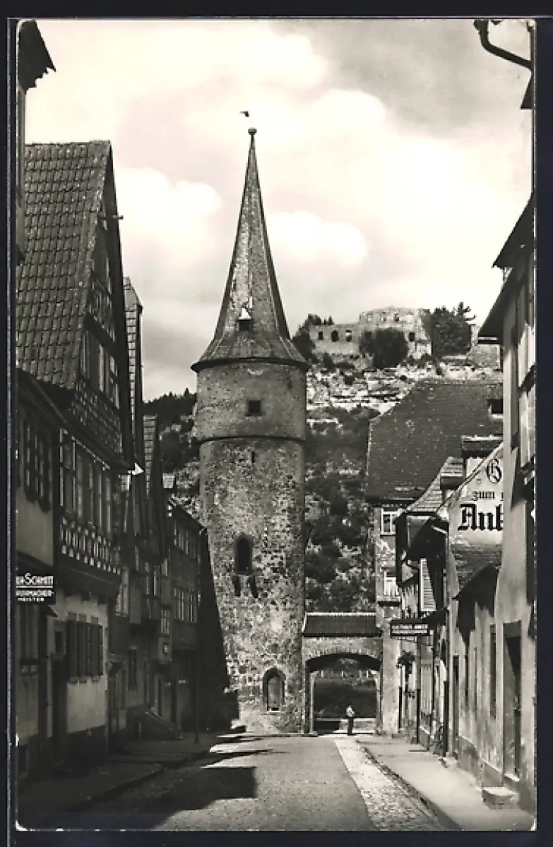 AK Karlstadt /Main, Maingasse mit Ruine Karlsburg