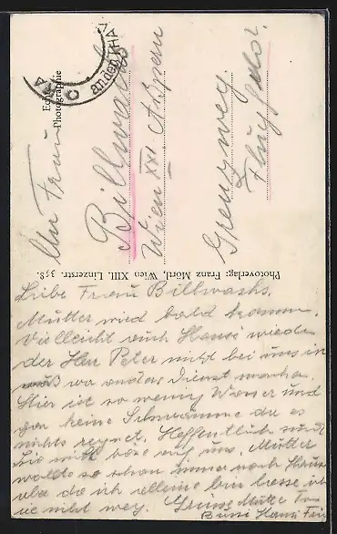 Personenbezogene Daten auf der Rückseite der Karte wurden durch blauen Textmarker unkenntlich gemacht. Die blauen Stellen sind auf die Vorderseite durchgeweicht und wirken sich negativ auf das Postkartenfoto aus