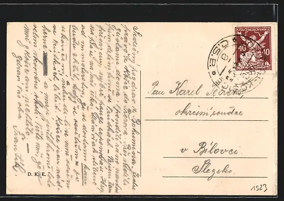 Personenbezogene Daten auf der Rückseite der Karte wurden durch blauen Textmarker unkenntlich gemacht. Die blauen Stellen sind auf die Vorderseite durchgeweicht und wirken sich negativ auf das Postkartenfoto aus