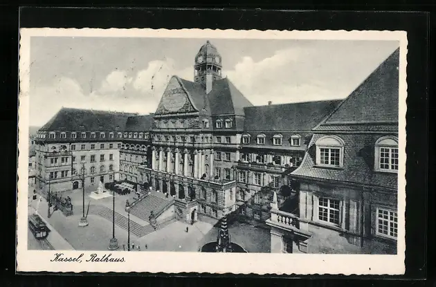 AK Kassel, Rathaus mit Strassenbahn