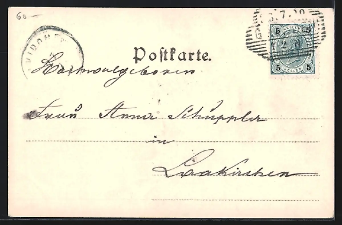 Personenbezogene Daten auf der Rückseite der Karte wurden durch blauen Textmarker unkenntlich gemacht. Die blauen Stellen sind auf die Vorderseite durchgeweicht und wirken sich negativ auf das Postkartenfoto aus
