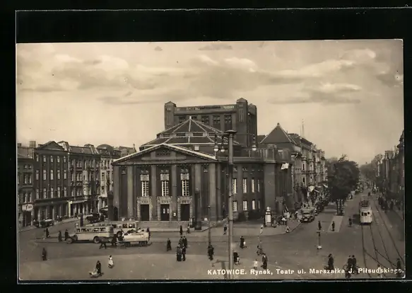 AK Katowice, Rynek, Teatr ul. Marszalka, Strassenbahn