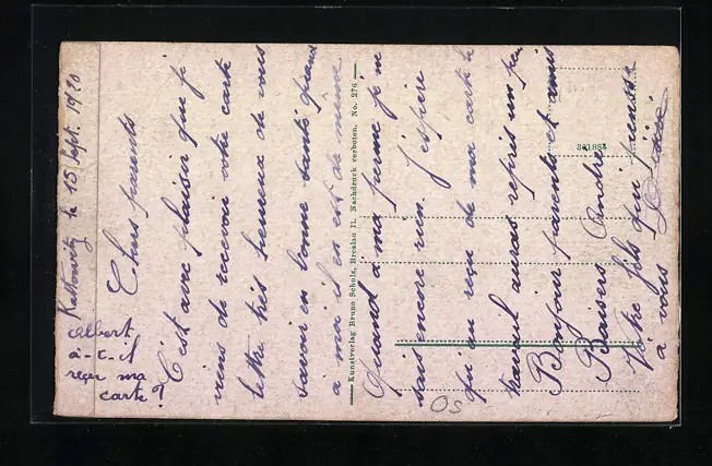 Personenbezogene Daten auf der Rückseite der Karte wurden durch blauen Textmarker unkenntlich gemacht. Die blauen Stellen sind auf die Vorderseite durchgeweicht und wirken sich negativ auf das Postkartenfoto aus