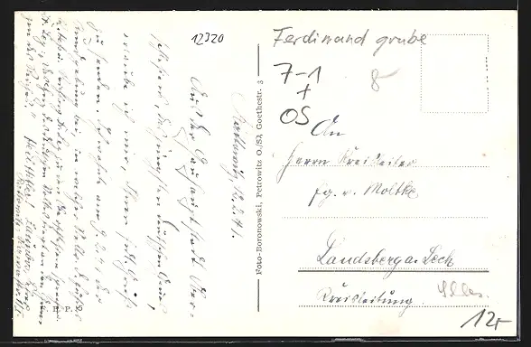 Personenbezogene Daten auf der Rückseite der Karte wurden durch blauen Textmarker unkenntlich gemacht. Die blauen Stellen sind auf die Vorderseite durchgeweicht und wirken sich negativ auf das Postkartenfoto aus