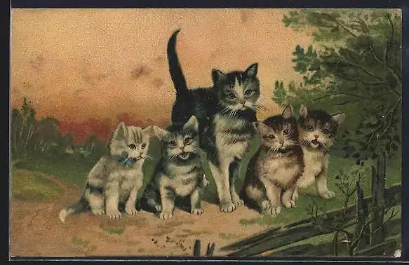 AK Katze mit jungen Kätzchen