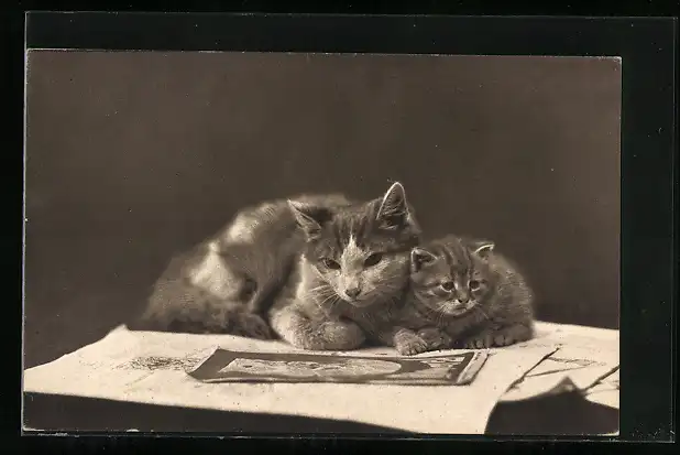AK Katze und Katzenjunges liegen auf einer Zeitung