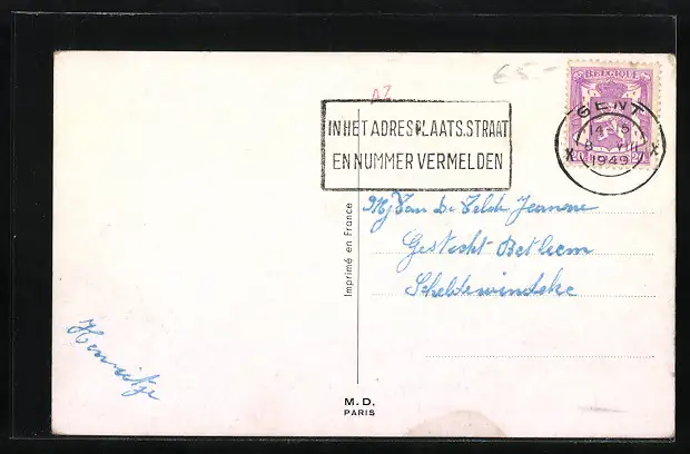 Personenbezogene Daten auf der Rückseite der Karte wurden durch blauen Textmarker unkenntlich gemacht. Die blauen Stellen sind auf die Vorderseite durchgeweicht und wirken sich negativ auf das Postkartenfoto aus