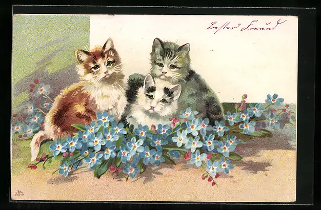 AK Katzen mit Vergissmeinnicht