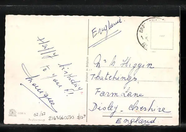 Personenbezogene Daten auf der Rückseite der Karte wurden durch blauen Textmarker unkenntlich gemacht. Die blauen Stellen sind auf die Vorderseite durchgeweicht und wirken sich negativ auf das Postkartenfoto aus