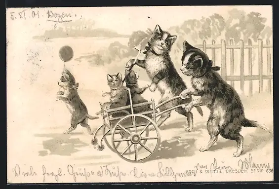 AK Katzenmutter schiebt ihre Kinder in einem Wagen