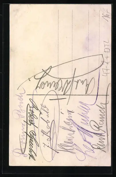 Personenbezogene Daten auf der Rückseite der Karte wurden durch blauen Textmarker unkenntlich gemacht. Die blauen Stellen sind auf die Vorderseite durchgeweicht und wirken sich negativ auf das Postkartenfoto aus