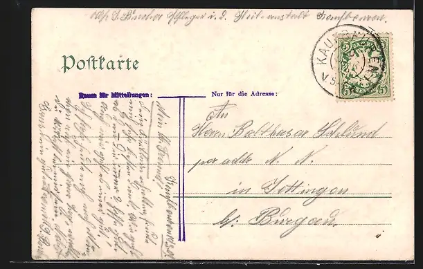 Personenbezogene Daten auf der Rückseite der Karte wurden durch blauen Textmarker unkenntlich gemacht. Die blauen Stellen sind auf die Vorderseite durchgeweicht und wirken sich negativ auf das Postkartenfoto aus