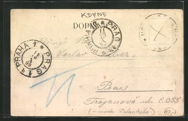 Personenbezogene Daten auf der Rückseite der Karte wurden durch blauen Textmarker unkenntlich gemacht. Die blauen Stellen sind auf die Vorderseite durchgeweicht und wirken sich negativ auf das Postkartenfoto aus