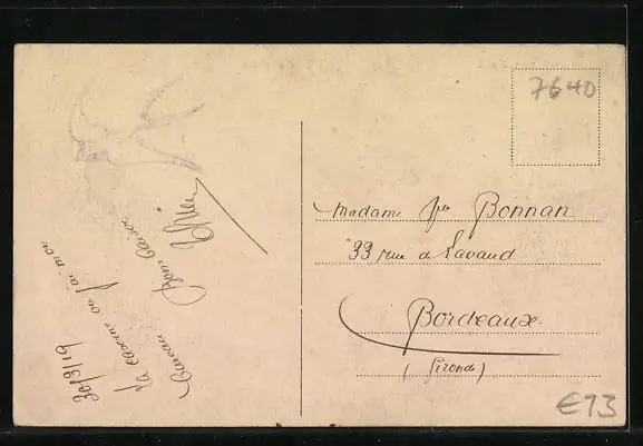 Personenbezogene Daten auf der Rückseite der Karte wurden durch blauen Textmarker unkenntlich gemacht. Die blauen Stellen sind auf die Vorderseite durchgeweicht und wirken sich negativ auf das Postkartenfoto aus