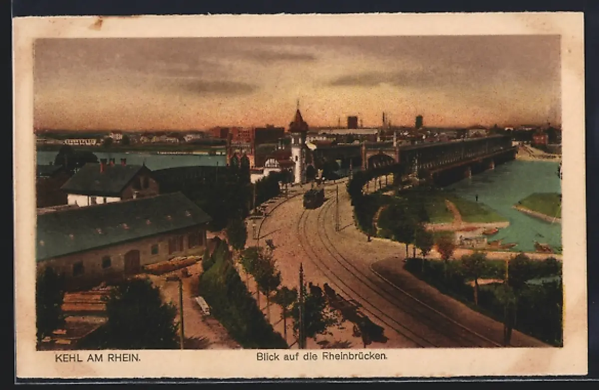 AK Kehl, Blick auf die Rheinbrücken, Strassenbahn