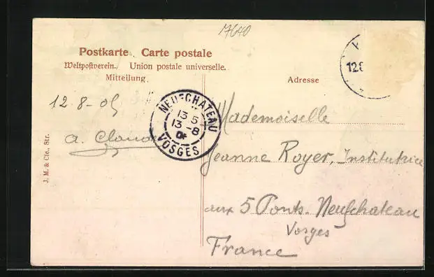 alte Ansichtskarte, gelaufen, Briefmarke entfernt, Stempelspur, guter Zustand