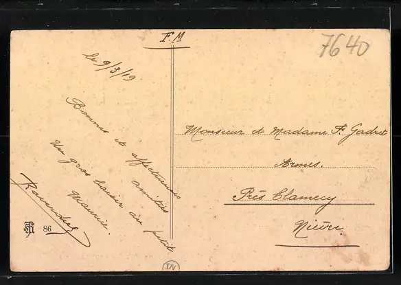 Personenbezogene Daten auf der Rückseite der Karte wurden durch blauen Textmarker unkenntlich gemacht. Die blauen Stellen sind auf die Vorderseite durchgeweicht und wirken sich negativ auf das Postkartenfoto aus