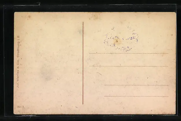 Personenbezogene Daten auf der Rückseite der Karte wurden durch blauen Textmarker unkenntlich gemacht. Die blauen Stellen sind auf die Vorderseite durchgeweicht und wirken sich negativ auf das Postkartenfoto aus