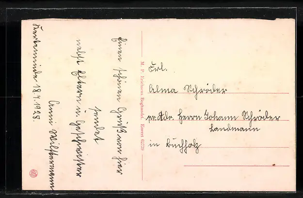 Personenbezogene Daten auf der Rückseite der Karte wurden durch blauen Textmarker unkenntlich gemacht. Die blauen Stellen sind auf die Vorderseite durchgeweicht und wirken sich negativ auf das Postkartenfoto aus