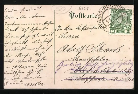 Personenbezogene Daten auf der Rückseite der Karte wurden durch blauen Textmarker unkenntlich gemacht. Die blauen Stellen sind auf die Vorderseite durchgeweicht und wirken sich negativ auf das Postkartenfoto aus