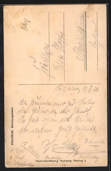 Personenbezogene Daten auf der Rückseite der Karte wurden durch blauen Textmarker unkenntlich gemacht. Die blauen Stellen sind auf die Vorderseite durchgeweicht und wirken sich negativ auf das Postkartenfoto aus